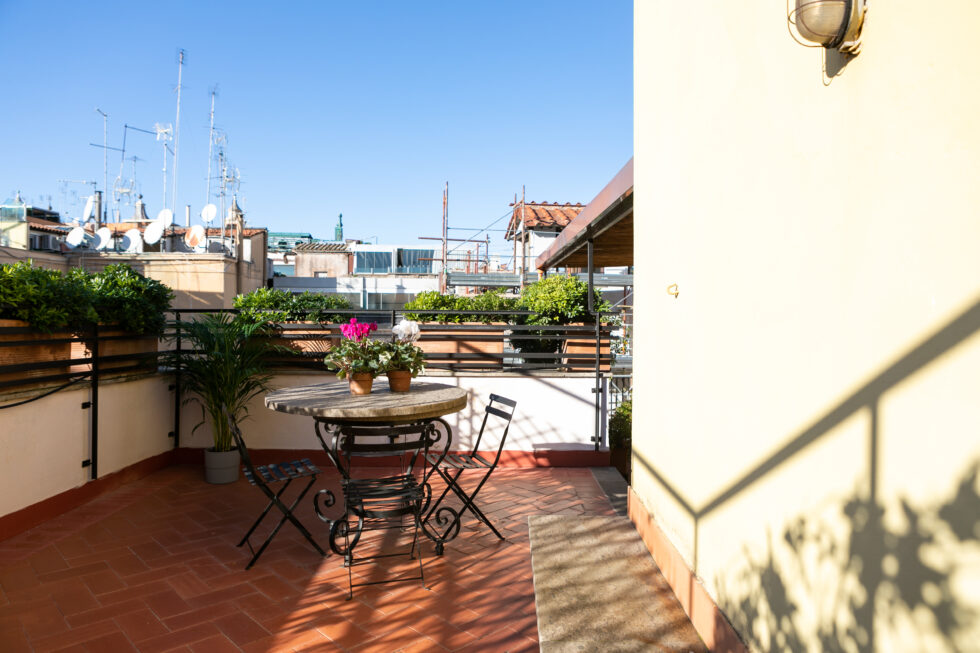 The apartment is composed of a bedroom with a double bed, a living room with a double sofa bed and dining table, an en-suite bathroom with shower, a kitchenette, and a terrace overlooking the famous Via del Babuino, with a view of Piazza del Popolo and the rooftops of Rome.