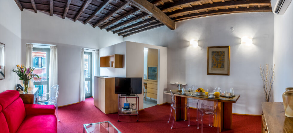 Each of these apartments has a double bedroom, a living room with a kitchenette and a bathroom. They also sleep up to three in a double sofa bed and a pull-out single bed. They all overlook the celebrated Via del Babuino.