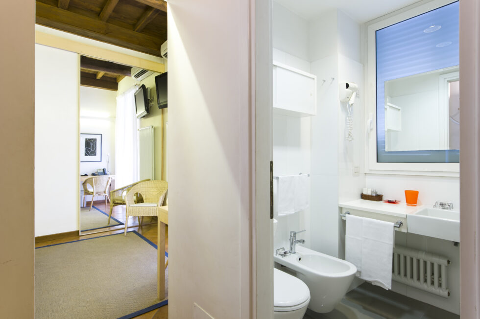 Monolocale composto da una camera da letto matrimoniale o due letti singoli, un cucinotto ideale per la preparazione della prima colazione e un bagno con doccia. Balcone dotato di tavolino e sedie che si affaccia sul cortile interno.